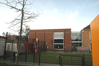 | De nieuwbouw op het schoolplein: achterin de oude gymzaal die aula wordt en links een nieuw klaslokalengebouw en nieuwe gymzaal. | De nieuwe gymzaal op het schoolplein, die met een corridor verbonden is met het leslokalengebouw aan de Van Voornestraat. foto's © paul kriele, 6 februari 2014. |