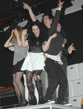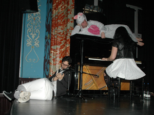 Niet alleen de acteurs, maar veelal de emoties lagen in het stuk 'Haha,kijk ons nou' regelmatig op de vloer en op de catwolk. De ruimte van het koningstheater werd breed benut. Het konijn vertolkte vaak de zelfspot. Maar van deze komiek werd aan 't slot afscheid genomen. foto's © paul kriele, 19 februari 2014. |