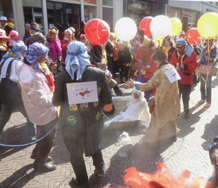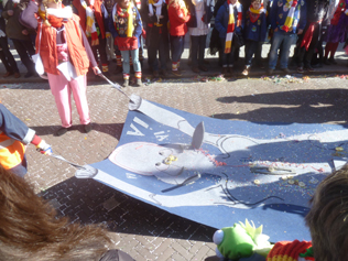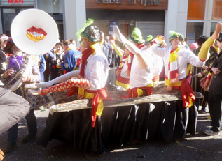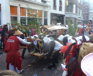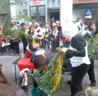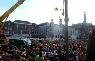 | Om kwart voor vier onthulde Prins Amadeiro XXV eindelijk, na in zijn mandje een rondje over de Markt te hebben gedaan met de kraan van Saan, Knillis. foto' s © paul kriele, 2 maart 2014. | ![]() |