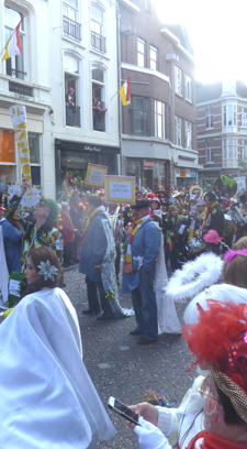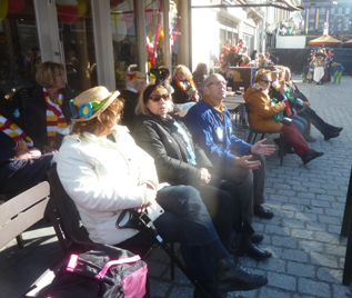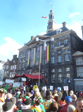 | -Rechts boven: Duizenden wachten op de Markt in de zon op de lange toespraken van de prins, de burgemeester en Peer van den Muggenheuvel. Knillis werd tegen kwart voor 4 onthuld. -Rechts: Bij de wc-cabines kwam filevorming voor. Voor Hotel Central en in diverse straajes raakte de mensenmassa vast . -Boven: Op de terrassen streken -met name ouderen- neer voor wat voorjaarszonnestralen. foto 's © paul kriele, 2 maart 2014. | ![]() |