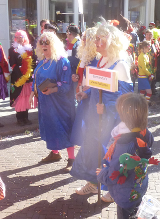 | -Boven: Ontdooien meej carnaval. -Rechts boven: De Geniekes: Miljoenen veur un brug. Dat hebbe we graag terug.. -Rechts: Gezocht ouwe zweefteef om meej saome te hange.. -Op de voorgrond nog wat 'wollukken' van een weersdeelnemer. foto's © paul kriele, 2 maart 2014. | ![]() |