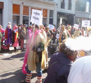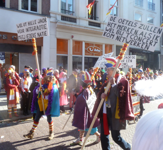 | -Boven: Kenne we haar niet van Bakker Korengoud..? Allerlei variaties op aarde en geaardheid.. -Rechts Integraotie met iedere natie en netwerken om bij het Oetelkonzert te kunnen komen... -Onder Jan Krielaars en ega.. -Rechts onder: Hangwethouder Bart Eigeman. en onderaan Piet Lathouwers. Die draagt het bord mee met de tekst: Kim Kutter. Waor bende Nou? foto' s © paul kriele, 2 maart 2014. | ![]() |