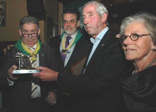 De uitreiking van de Moeder Truus Poffer door de voorzitter van de komische fanfare De Kikvorschen Bertie van de Heuvel aan de directeur van de Bossche Voedselbank, Jos Berkelmans. Rechts echtgenote Els Brekelmans. Midden achter Hans Bosmans die met deze traditie de naam en de verdienste van zijn grootmoeder Truus Bosmans-Den Dunnen, hoog wil houden. |