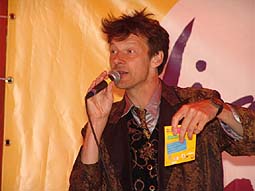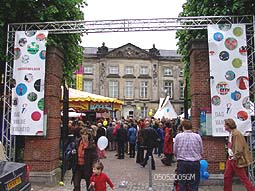 Links boven: De rijk versierde ingang van het anders zo nette Museumplein... Boven: Peer de Graaf, the great entertainer for kids.. die ook geschminkt kodnen worden. foto's © gerard monté, 5 mei 2005. |