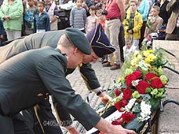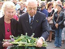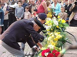 | Links: de kranslegging door Groen Links, afdeling Den Bosch, Antoon van Rosmalen-van den Eerenbeemt. | Rechts: Noord-Zuid Bevrijdingsfestival mevrouw Anneke Buijs en heer Vos. foto's © gerard monté, 4 mei 2007. |