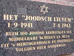 Hierboven de herinnering aan het Joods lyceum aan de Papenhulst waar Joodse kinderen van 12-16 jaar in 1944 naar toe werden gezonden alvorens ze werden afgevoerd naar concentratiekampen. Als nagedachtenis aan deze overleden scholieren staat er een Joods herdenkingsmonument in de Casinotuin dat geadopteerd werd door scholieren van St.Janslyceum en Het Bossche Broek. foto's © gerard monté, 4 mei 2007. |