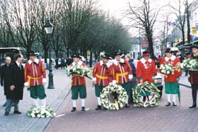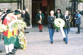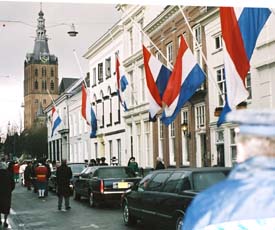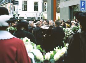 | Defilé van een afvaardiging van het gilde. | Rechts politiemannen dragen de baar de zwarte limousine binnen. - foto' © paul kriele, 8 februari 2006. |