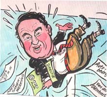 | De door Cor Versteeg getekende cartoon bij het afscheid van Joep Chappin waarin de veelzijdigheid van deze man tot uiting komt. © cor versteeg. |