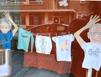 De ruimten bij de ingang en de etalage er naast worden voorlopig ingenomen door de kunstenares Judith Rosema *[bedrukte textiel en bordjes], Jolanda van de Winkel** onder de naam Jill&Rose en personal trainer Debbie Pronk.